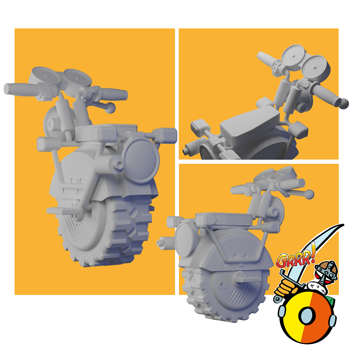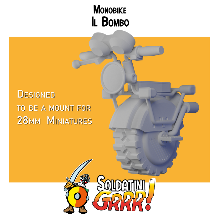 In questo kit troverai le due parti per comporre la moto da cross monoruota “IL BOMBO”. Adatta per essere cavalcata dalle miniature delle più note ambientazioni fantascientifiche. Non comprende il pilota, anche perché i tuoi modelli faranno a gara per salirci sopra! Basetta non inclusa, per permetterti di sfoggiarla anche nel diorama super tamarro del tuo garage post apocalittico. Sgomma, inchioda e vai a manetta, in barba ad ogni norma sulla sicurezza, in sella all’indomabile “IL BOMBO”!